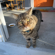 Very large tabby! Orange around the nose. Blue collar with no name tag.