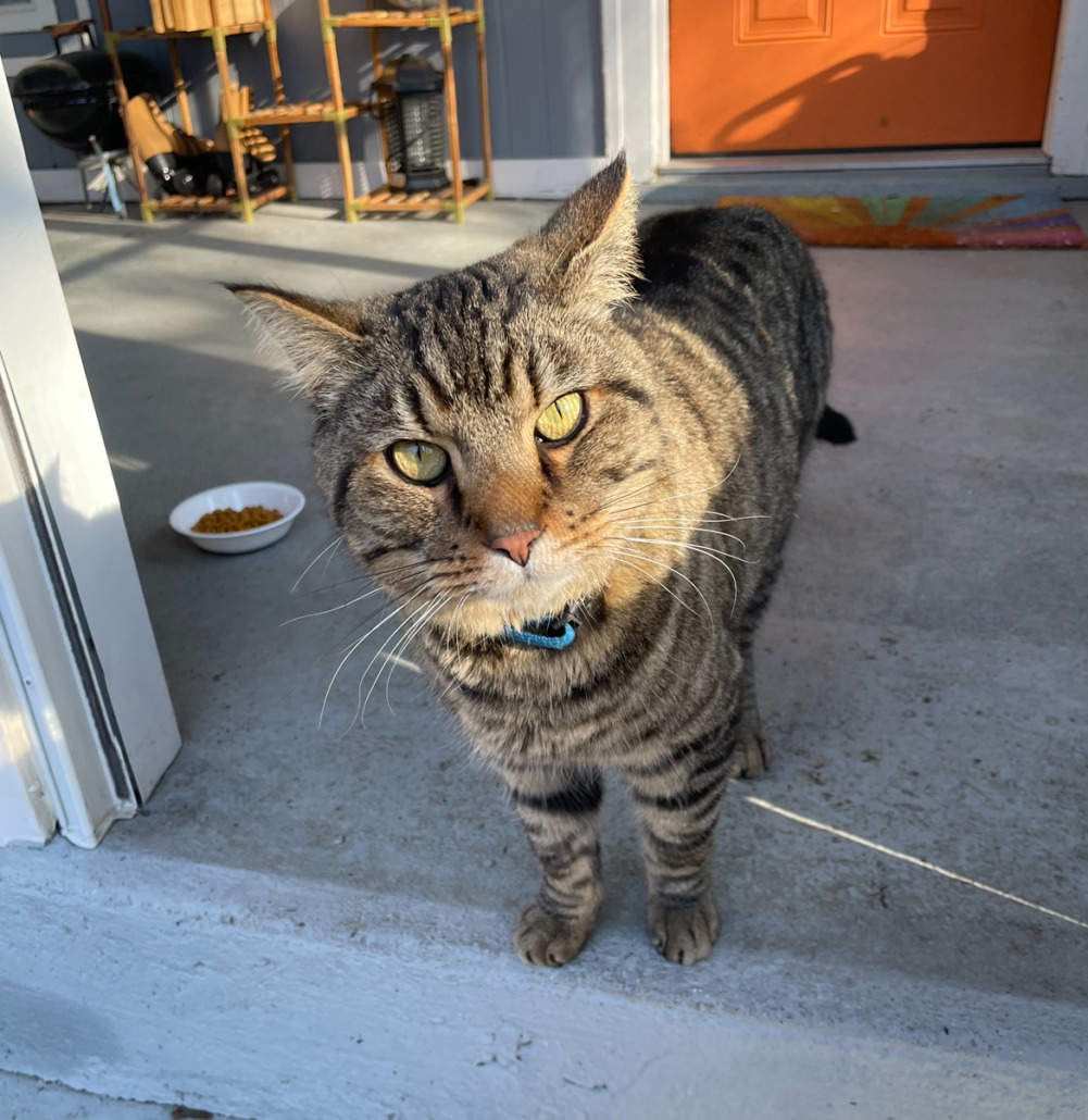 Very large tabby! Orange around the nose. Blue collar with no name tag.
