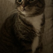 She’s a female American Shorthair cat. She has green eyes. Tabby cat. White color in chest area. White paws. Friendly with strangers but is very timid. Gets scared easily and likes hiding.