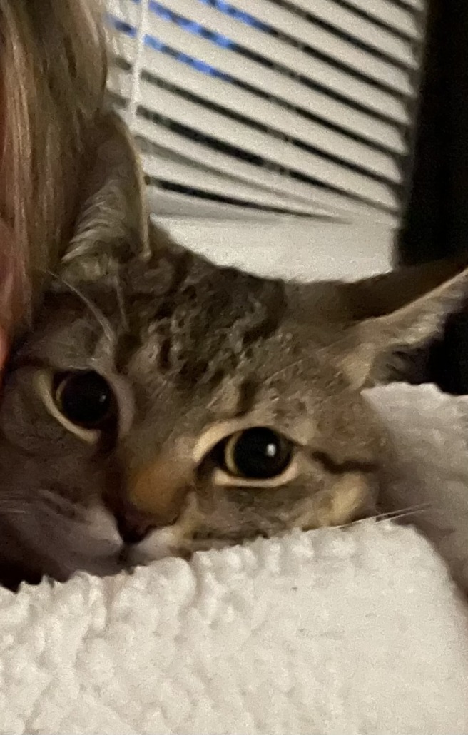 Medium tabby cat not neutered or chipped. A little over 1 year old. Inside cat not made for the cold!!!