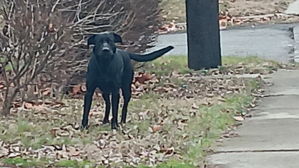 Black dog, possibly a lab. Roaming around for the last couple of days between west Washington and Michigan. Doesn’t seem aggressive but is skittish.