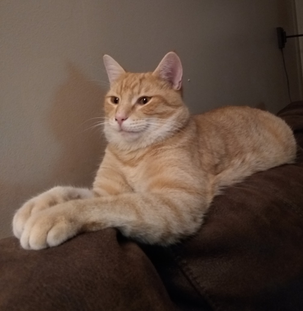 Binx (aka Binxie) is a 3 1/2 yr old neutered male, buff/diluted orange tabby of about 15 – 20 lbs (muscle, not fat). He is microchipped (#991003001015194). He is very friendly and comes to his name. For comfort, he sucks on & comfy claws fluffy blankets. He loves wet cat food (Friskies pate) & soft cat treats, He is strongly bonded to his brother, Moo. He was last seen near his home on Vincent Ave, wearing a reflective breakaway collar, but may no longer be wearing it. We believe a neighbor that travels frequently to Indy may have taken him and dumped him there, so he is possibly a very long way from home.