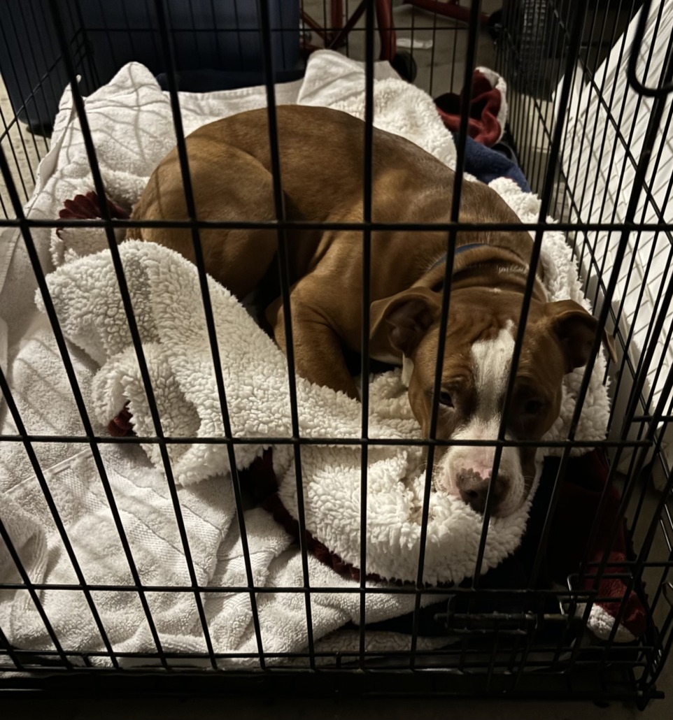 He’s a brown and white pit bull. He seems to be pretty young. He’s very friendly and seems crate trained. He’s wearing a collar with no tag. The dog he was running with on the road had no collar and would not let me approach it.