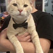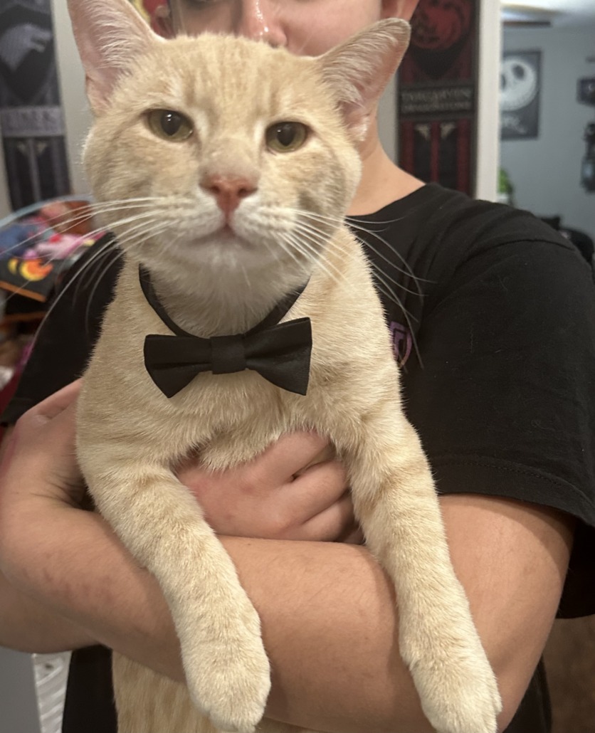 He is a indoor outdoor cat, usually just stays around the yard wearing black bowtie collar