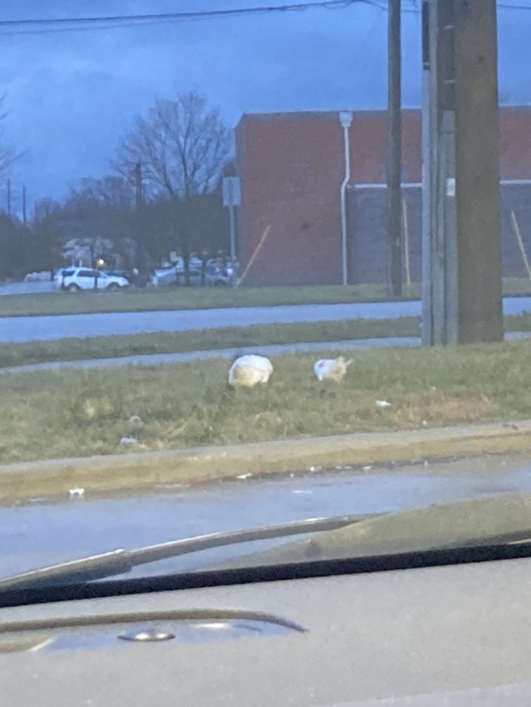 Two white ducks. Assume they are farm ducks since they are all white so someone might be missing them.