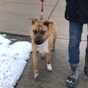 Tan male dog, looks like a bulldog/pit mix maybe. No chip. Super sweet and very social.