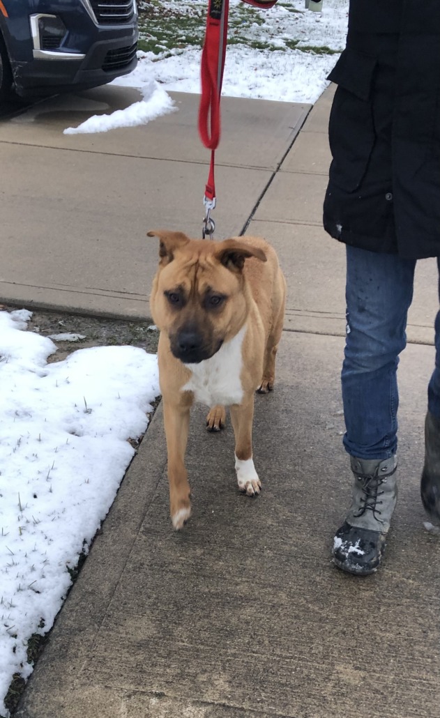 Tan male dog, looks like a bulldog/pit mix maybe. No chip. Super sweet and very social.