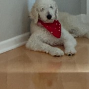 White and golden (Golden Doodle) Dark features (noise and eyes)