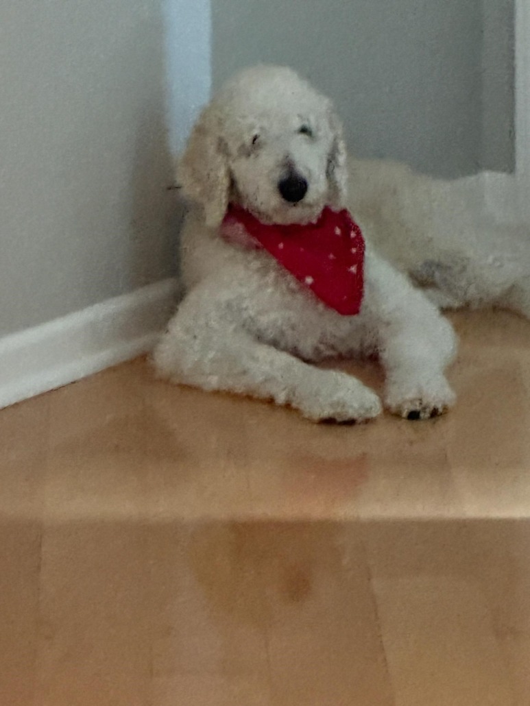 White and golden (Golden Doodle) Dark features (noise and eyes)