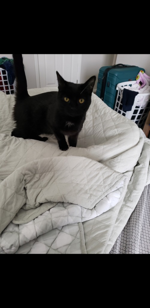 Small black cat, tiny white bit on chest, big white patch on belly.
