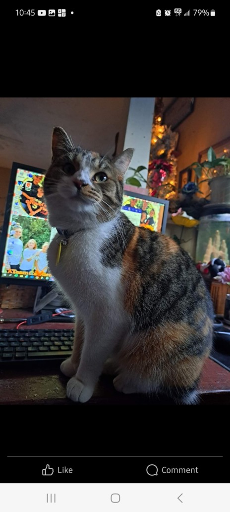 Jovi is a bobtail calico. She’s very sweet and petite. She is microchioped and did have on a collar with a bell. Although she may not still have it on because it is a breakaway for safety reasons. She’s very loved and missed.