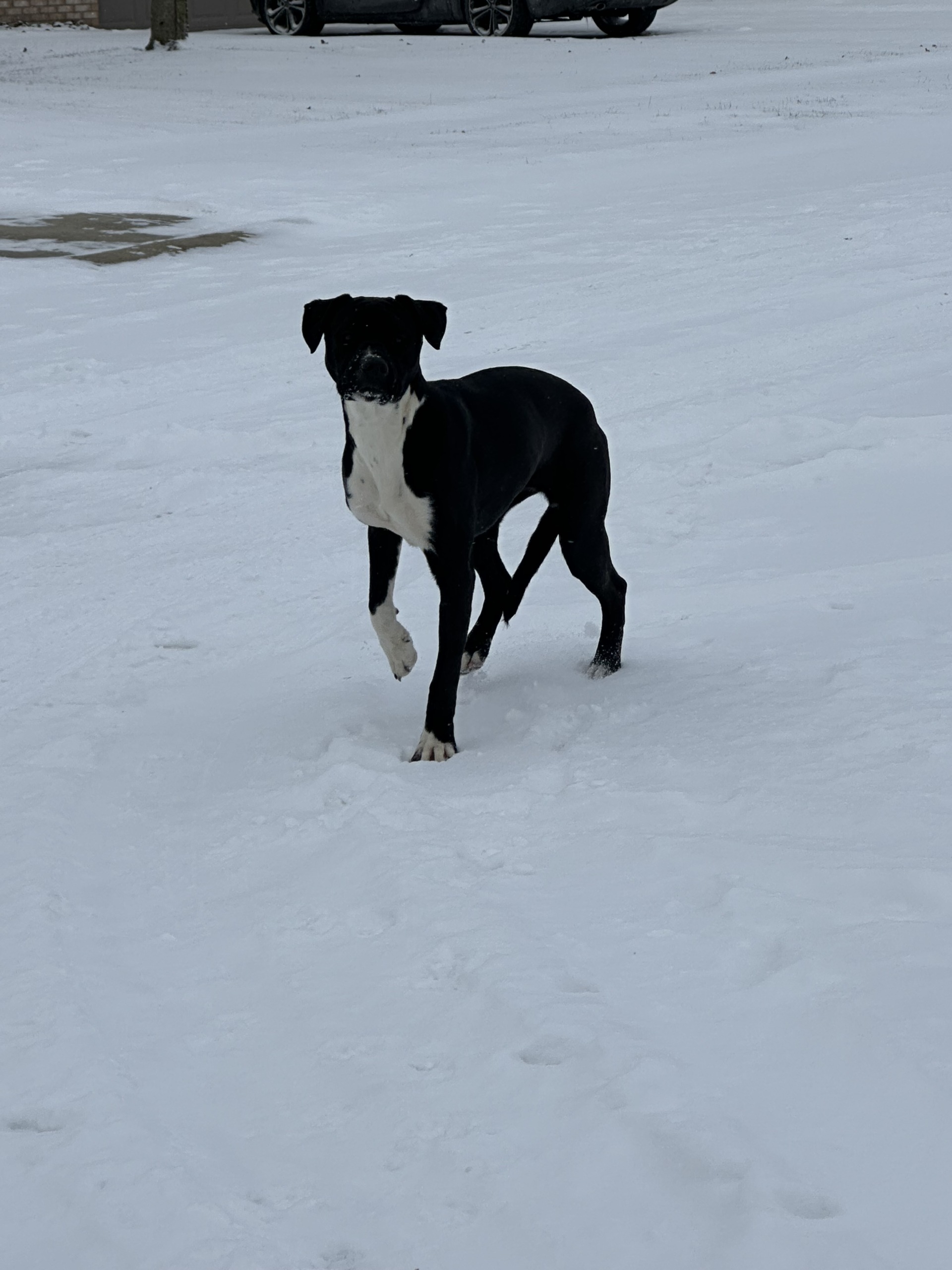 She looks to be maybe a pit mix of some type white and black. Proof of ownership is required.