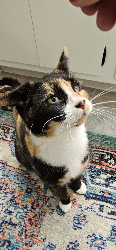 It’s either a tortoise or calico, very, very sweet. We took her to the vet. She wandered up to our home and wanted in and it was so cold we let her in. Very loving.