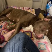 40 lb. brown with white markings female Pitt Bull with a purple collar found behind Guggman Haus Brewing Co. Undernourished and possibly pregnant or postpartum. Proof of ownership required to claim.