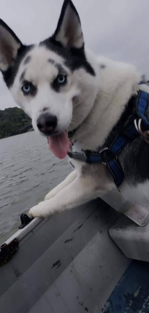 White and black Siberian husky 8 years old, beautiful blue eyes, distinctive markings on his eyes. He is nuetured, he had surgery on his front paw, about 6 months ago . Walks with a little limp. Very well trained .