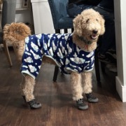 Yellow Goldendoodle he was wearing a blue and green sweater when lost