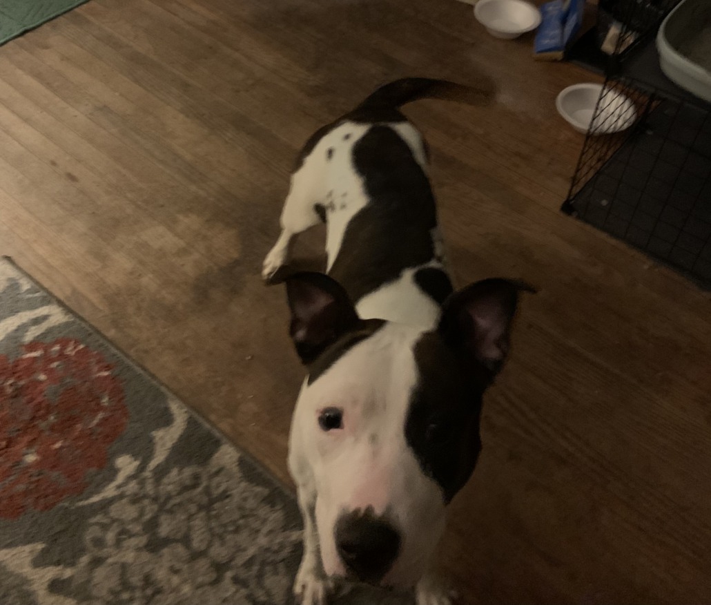 Black and white female. Appears taken care of. Gets along with my other dogs. Has a blue tint on her.