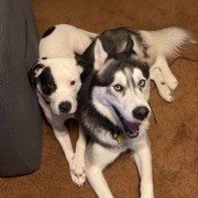 Female pitbull, white with black dots, unspayed, lost w our other dog, fairly well trained and responds to her name, outgoing and energetic friendly dog, scrape on her nose, purple collar