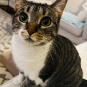 TIMID FEMALE TABBY CAT – GRAY & WHITE, GREEN EYES MICROCHIPPED – RED FLORAL COLLAR
