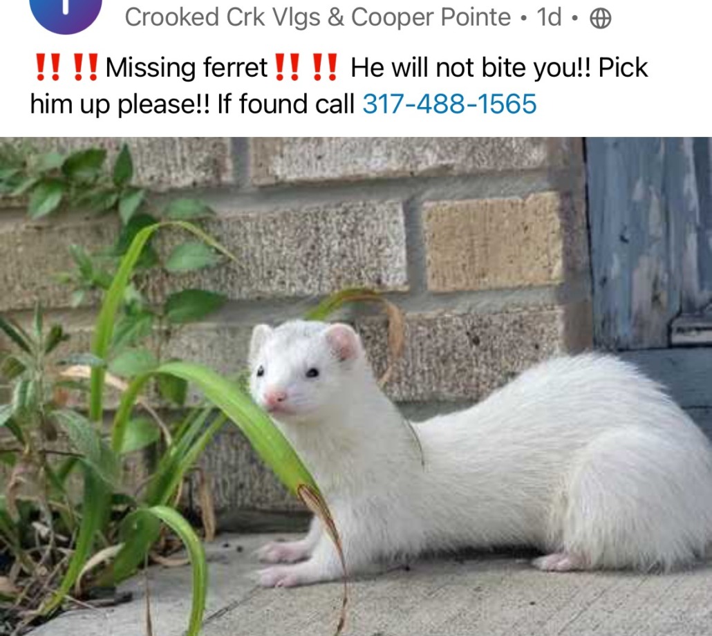All white male ferret with a little gray on the top of his head. His name is Reign and he will respond to whistles. Reign will not bite he is a sweet boy! Reign is 3 years old and will be 4 this summer. If anyone sees him please..please pick him up and contact me. We love him so very much! Thank you!
