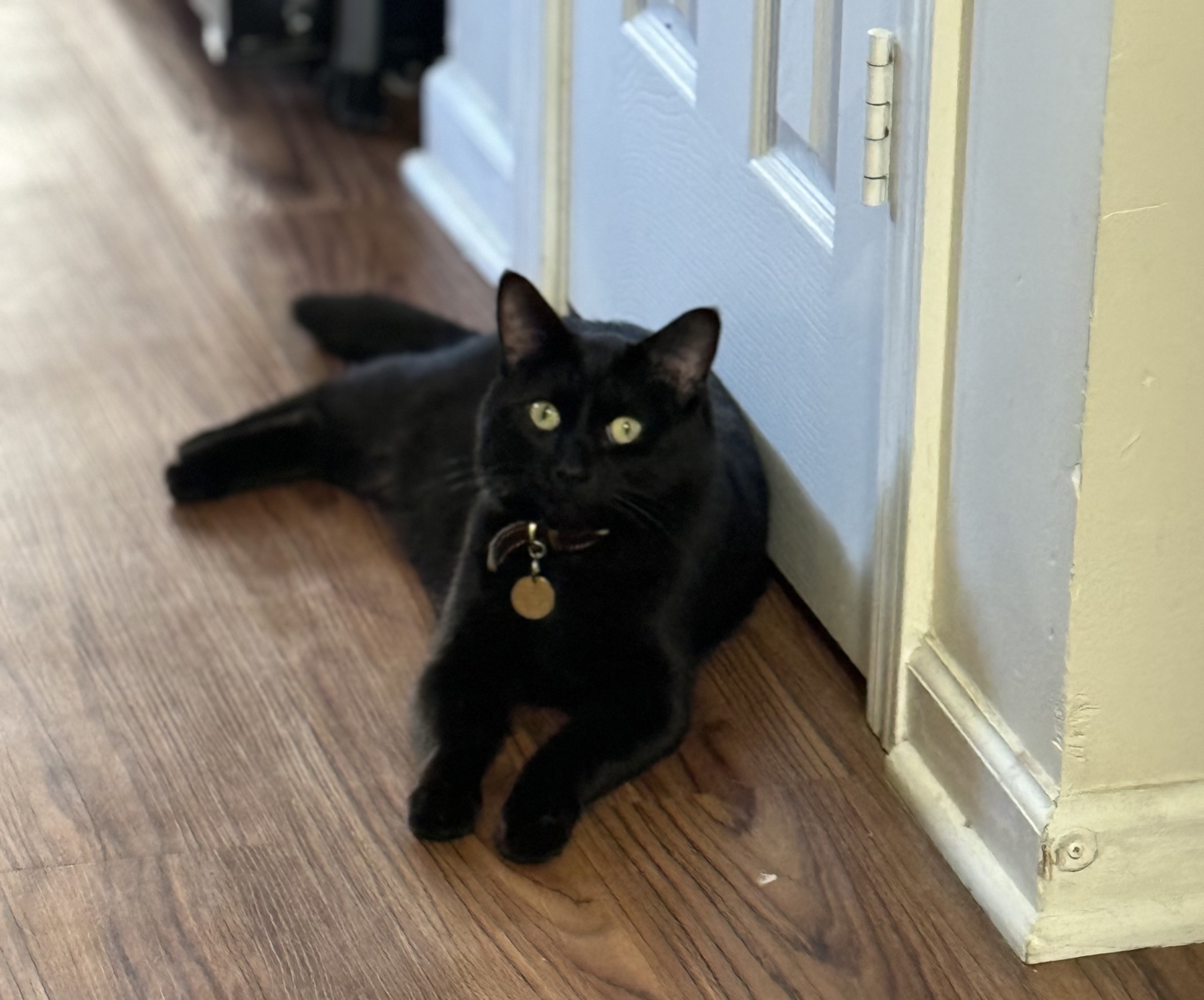 He is a male medium size black cat. Does respond to his name Ulysses.