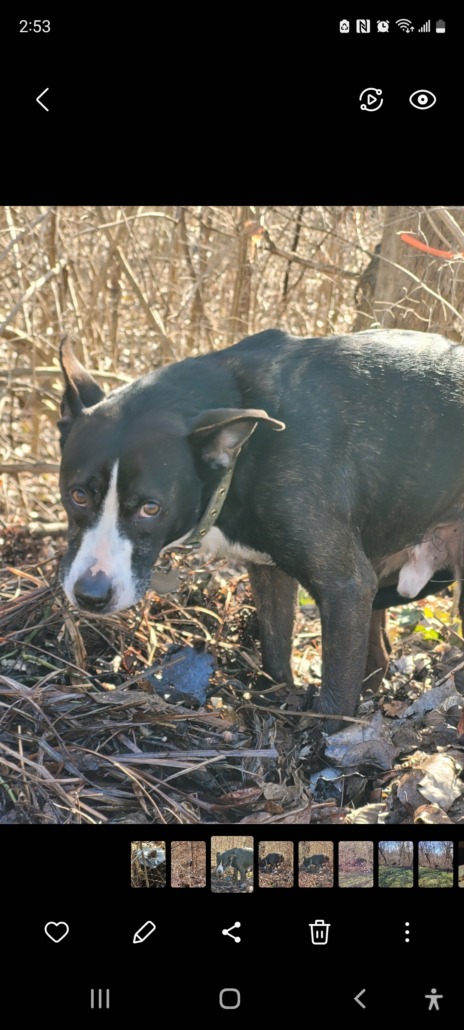 Friendly bit very scared and hungry. Had a hunter green wide collar on. Had 3 tags but they all were worn and I couldn’t read any of them. On the edge of woods between condos and a neighborhood on the northeast side of Indy near keystone walmart.