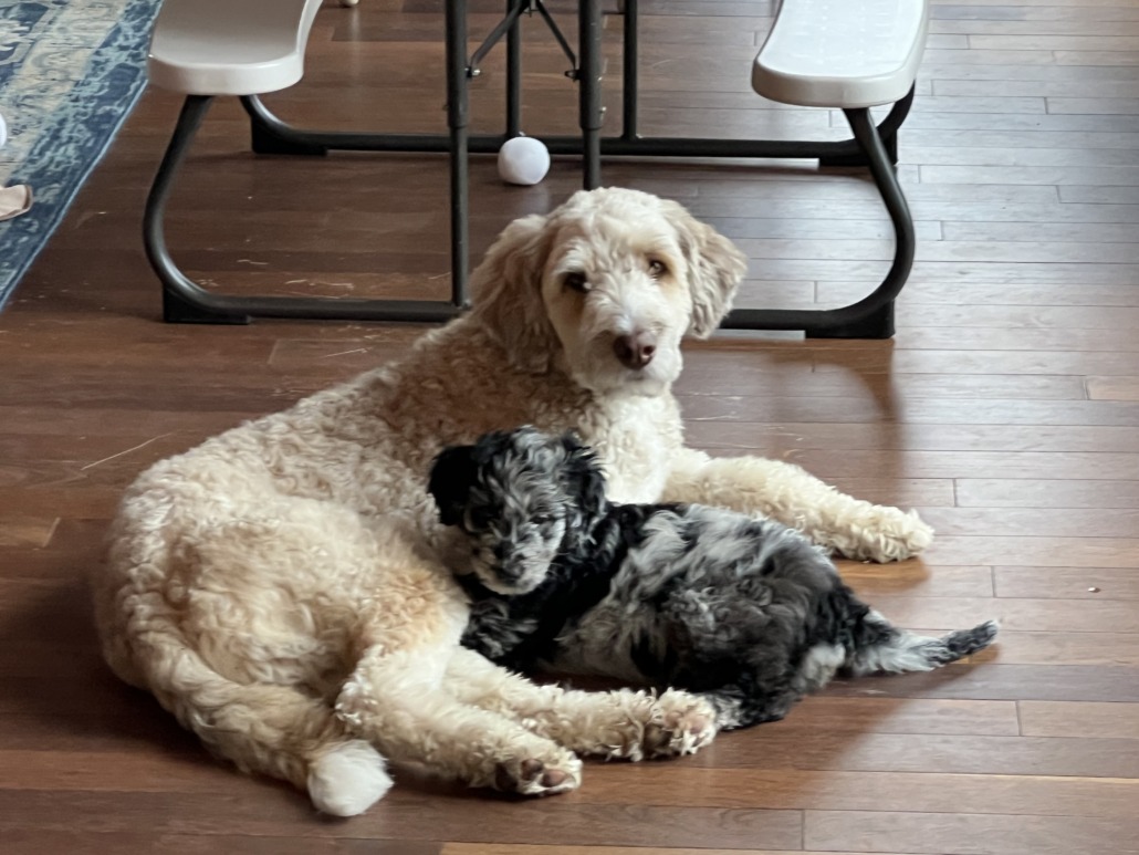 Cheeto is the golden color dog in the picture. He’s an Aussiedoodle. About 52 lbs. He has a microchip. Was last seen in Putnamville, IN about 2:00 on 2/5/24. He was also with our other dog pictured, 3 month old Coco. She’s a Merle Aussiedoodle.