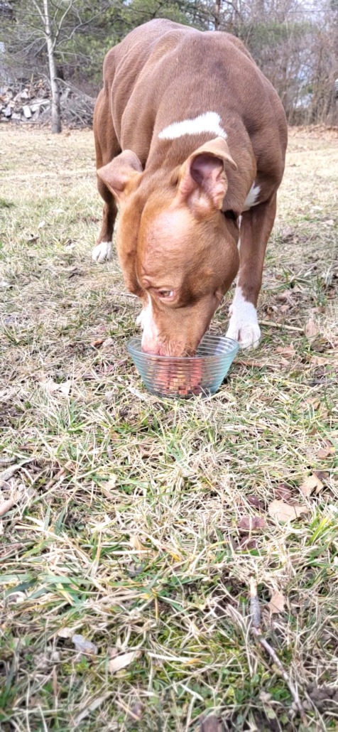 Brown female, maybe some type of pit mix. I pulled into my driveway and she was standing at my picnic table eating the cat food. She is very skittish. She let me give her food but she wouldn’t let me get close to her. She took off into the neighborhood behind me. No collar.