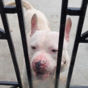 All white pitbull with ears that stand up and a red color