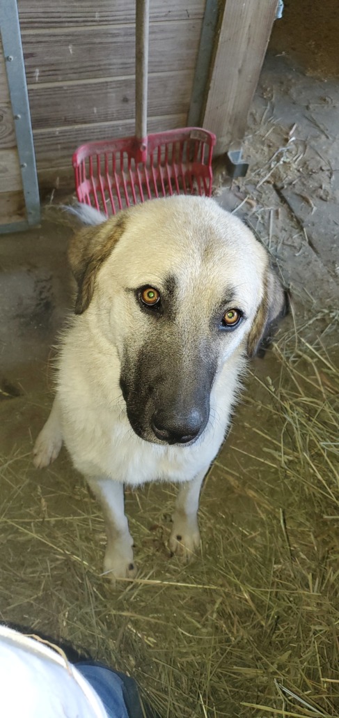 Anatolian cross LSG dog. about 90lbs 1.5 years old. very sweet. whiteish body with black ears and muzzle. can be shy around strange places.