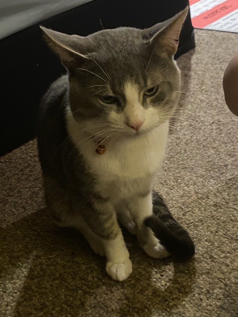 A calico white, gray male cat. Goes by the name of Smokii. Lost in our neighborhood. Did have a orange collar on but it was a snap away collar so I’m not positive if he still has it on.