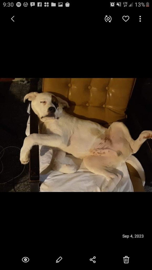 Pup breed is unknown breed hes a rescued almost 9months ago hes around 9 or 10 month old but very very big for his age. Hes probably a great pyramis rottweiler pit lab mix … he not a mean dog at all hes knows everyones likes and loves him so he will be looking for people hes a all play and love very very sweet dog. Had no collar ,Hes mainly white with a brown patch on one eye and one ear has a little light brown spotting He looks a lot like petty from little Rascals just longer hair and snout .. he has a some what bend or curl with his tail he was last see in the Bloomington area just by the Leonard springs rd. mayroad. Rockport rd. On Fowler rd