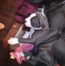 She is just a puppy pit/ mastiff mix. She don’t bark very much at all. She is Grey and white. The picture is old 1.