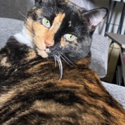 Maisy is a sweet little calico. She is declawed in the front- we adopted her that way. We miss her very much! She loves treats and cheese. She will be scared because she’s an indoor cat.