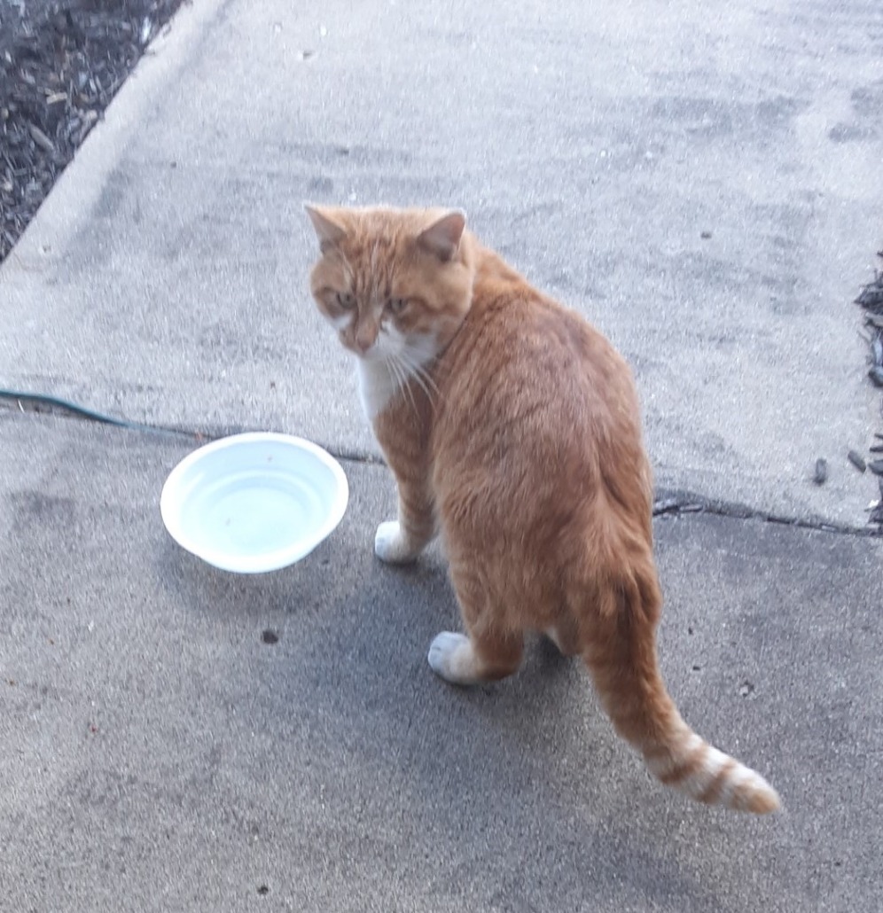 Orange/yellow and white plump kitty, very friendly, appears well cared for.