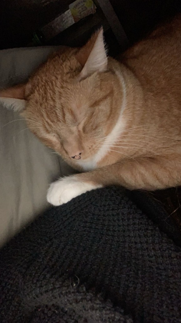 You absolutely can’t miss him. He is huge, bright orange with a white chest and meows constantly non stop.