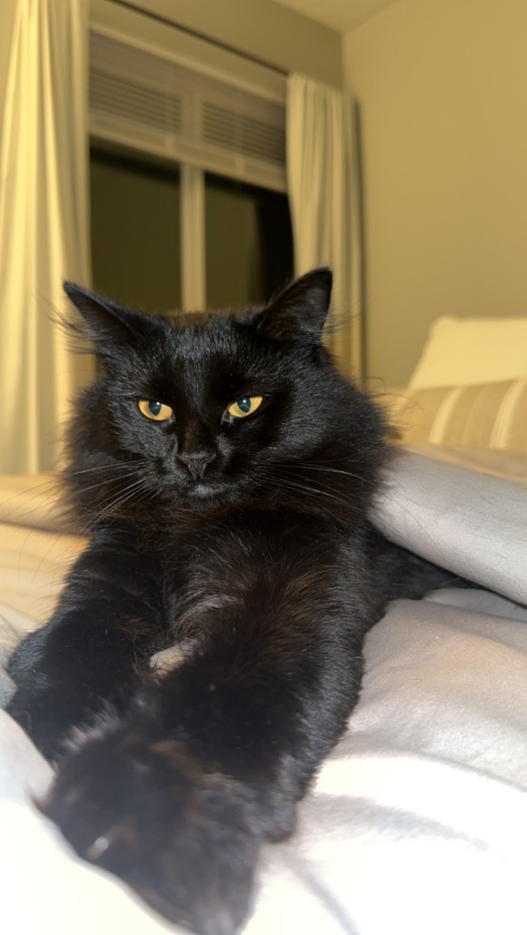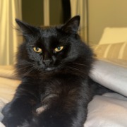 Sophia is a domestic long hair with black fur and yellow eyes. She is spade, microchipped, and up to date on vaccines.