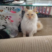 Mostly white with orange markings siamese mix cat. Very skittish/shy.