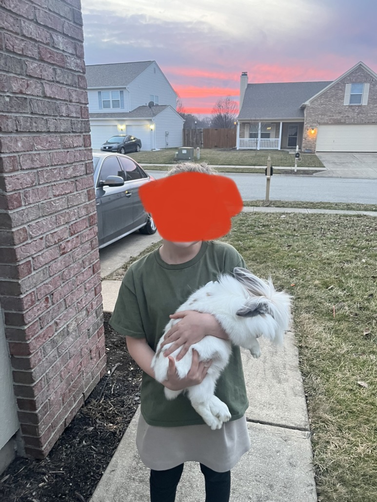 White rabbit with long gray hair in front.