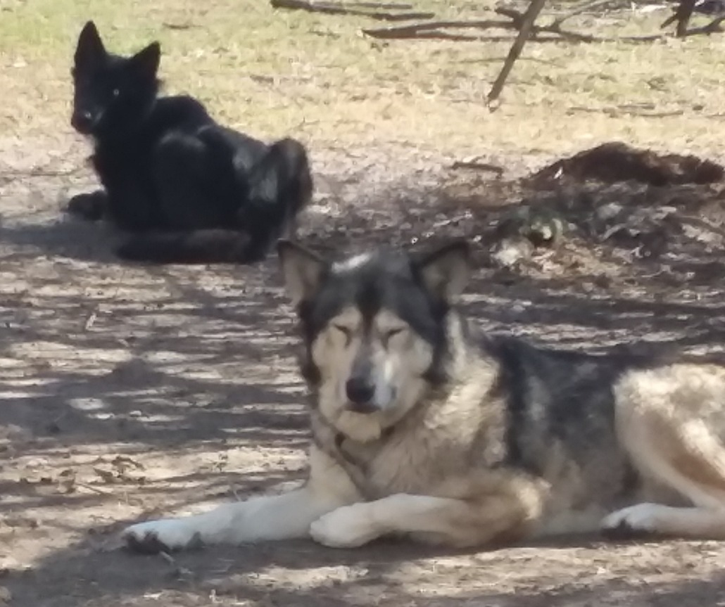 Traditional colored Malamute female. 11 yrs old, running with black GSD mix. Black collar