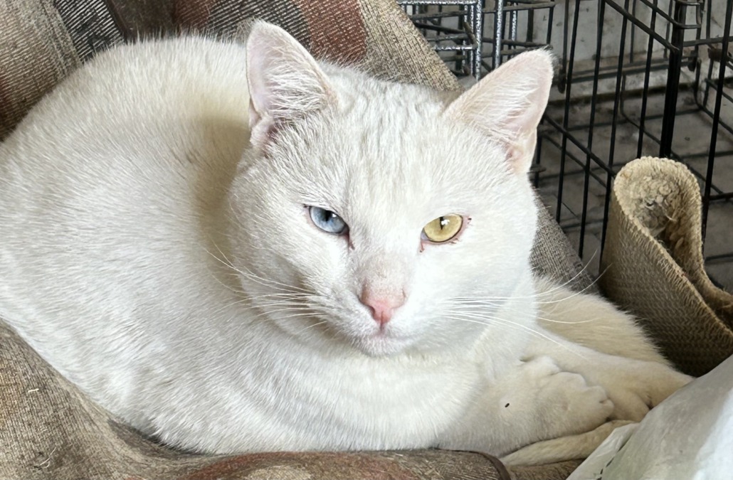 All white cat, one blue eye one green eye, polydactyl, is hanging around our neighborhood and our house since Friday. We do have a community of cats but I’ve never seen this one. I can’t not get closer they run.