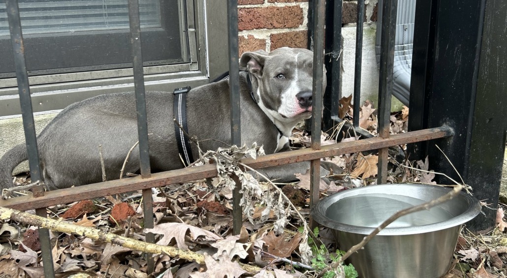 Gray and white neutered male pit bull mix, very shy and scared but not aggressive ; has harness but no collar and not sure if he’s microchipped