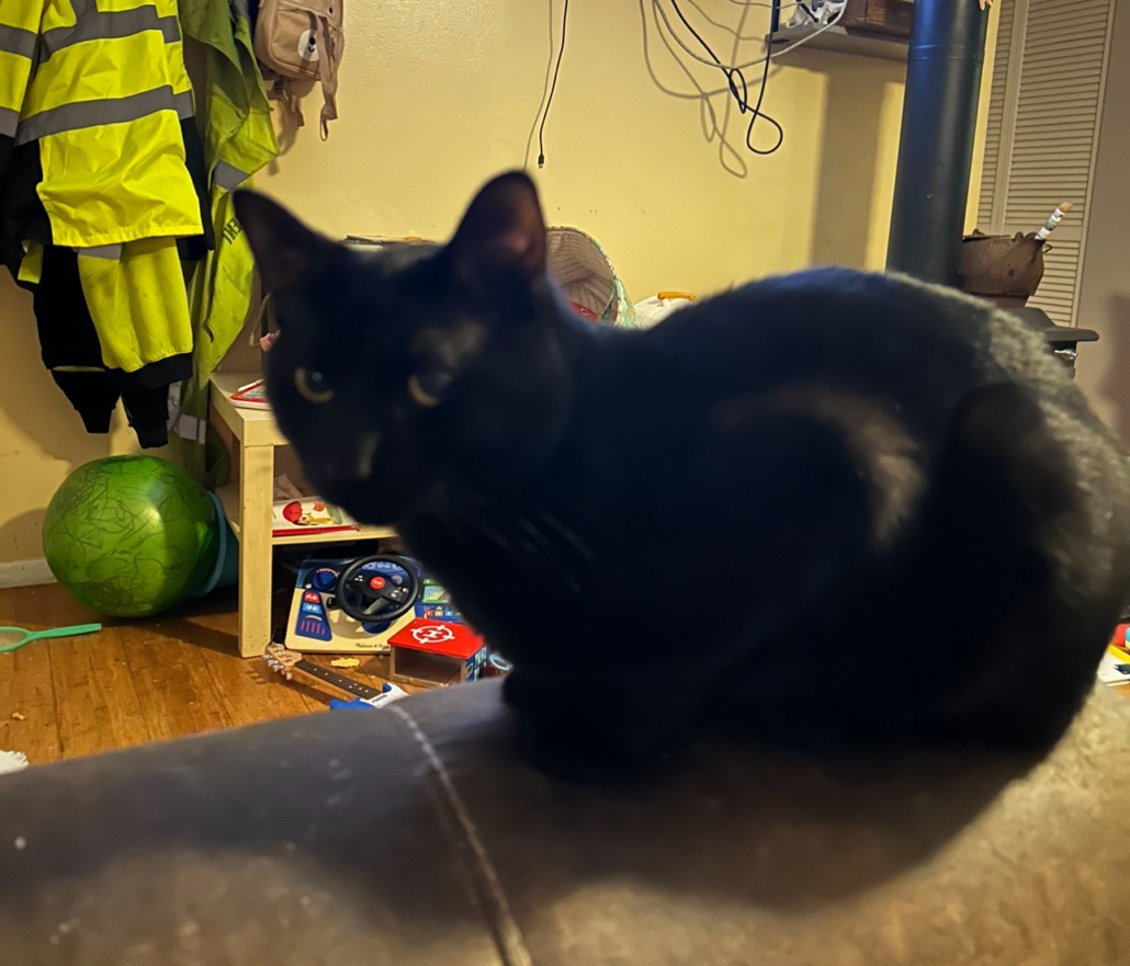 He is a small to medium sized solid black shorthair. He might come if called.