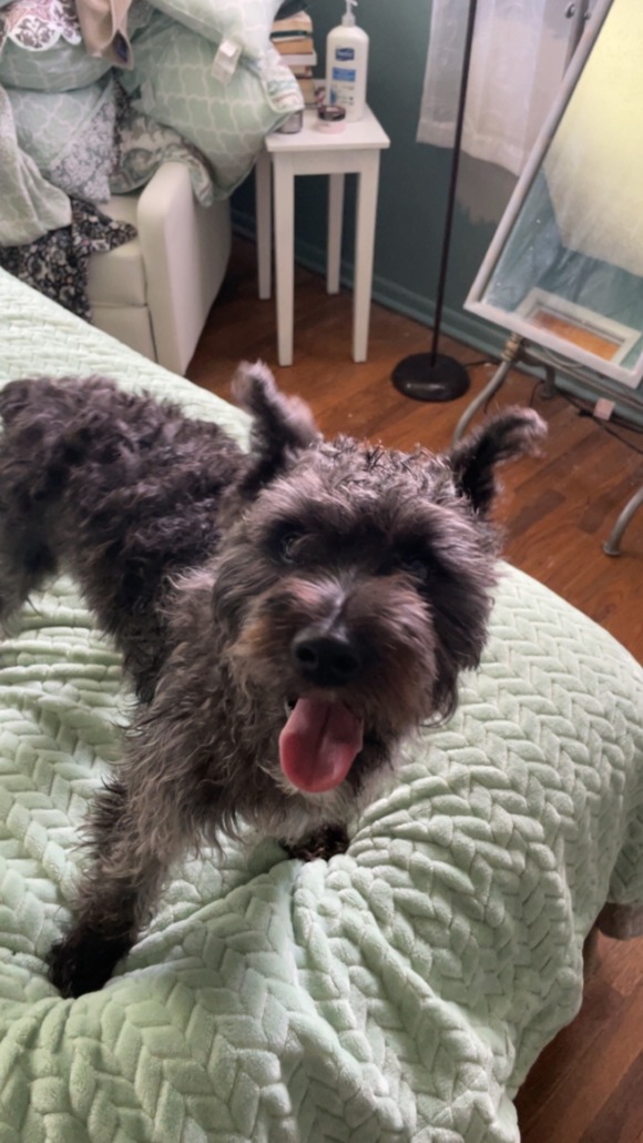 He is a miniature schnauzer. His coat is black and curly, eyes are brown. He is super friendly and loving and might come right up to you but also has known to be shy. He loves being picked up and loves to give licks. His nickname is “Simey” so he will respond to it.