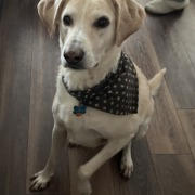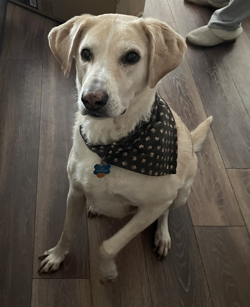He is wearing a purple collar. We just got him a new one and haven’t put his tags on it. He is not wearing the bandana in the picture.