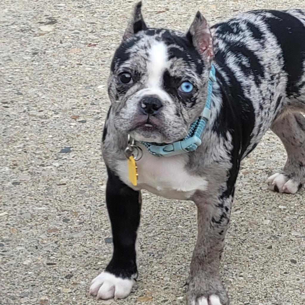 Tri Merle bullly 25 lbs was wearing gold chain collar and blue leash . One brown eye and one blue