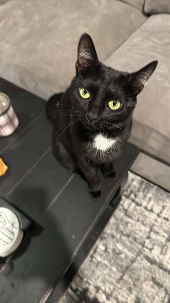 small black female cat approximately 5-8 lbs with a white star on her chest and white belly if on her back. lost in the 48th and broadway area. she is very trained and will come on command much like a dog.