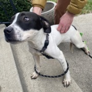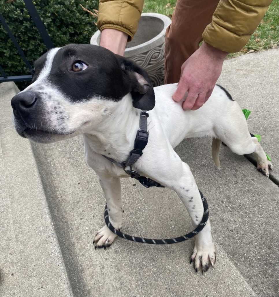 Young white dog with black ears and patches. Looks to be a puppy of maybe 6 months. Has collar, no chip, no tag, proof of ownership required. Found near Butler University