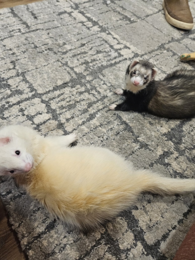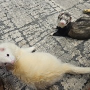 White male ferret about 2 years old. Friendly, adventurous, and playful. Slightly chunky with a whole lot of fluff. Has one crooked toe nail on front paw that is trimmed shorter.