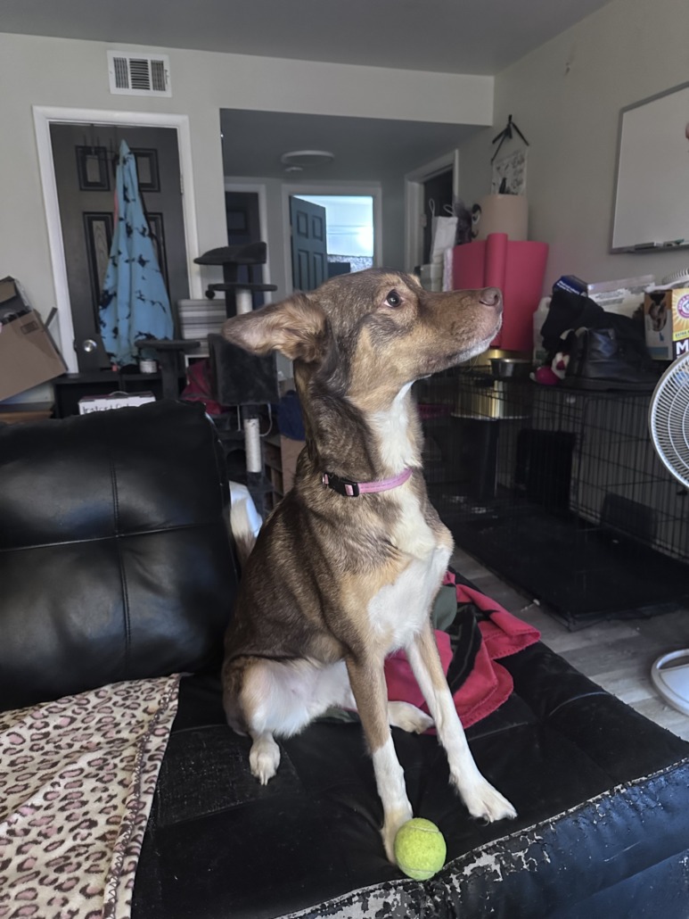 Brown tan and white on her chest paws and tip of her tale about 35 lbs wearing a pink collar
